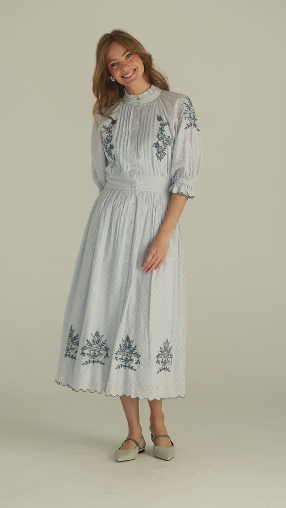 This blue dress has so many amazing details. The fabric has a beautiful texture and the dark blue embroidery is hand sewn .