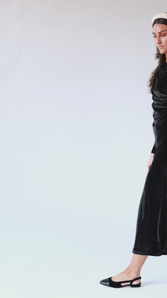 Discover  our velvet dress, masterfully draped and pulled to one side for a sleek, slender silhouette. The design features tight fitted sleeves that offer exceptional comfort and a flattering fit!