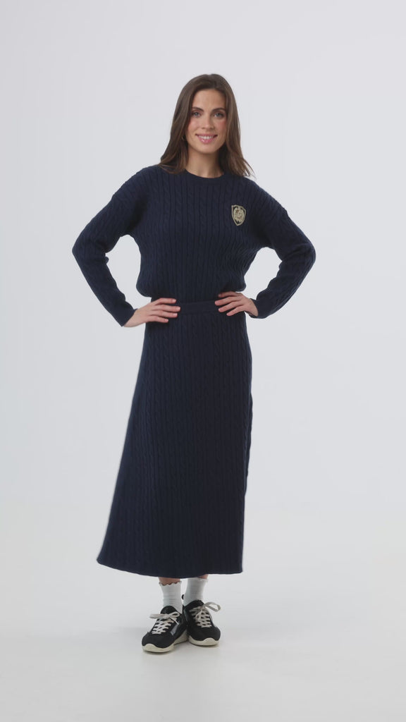 A navy soft cable knit sweater crafted for cozy everyday comfort with a timeless design. The patch emblem logo adds a subtle, elevated detail that effortlessly enhances your basic wardrobe staple.