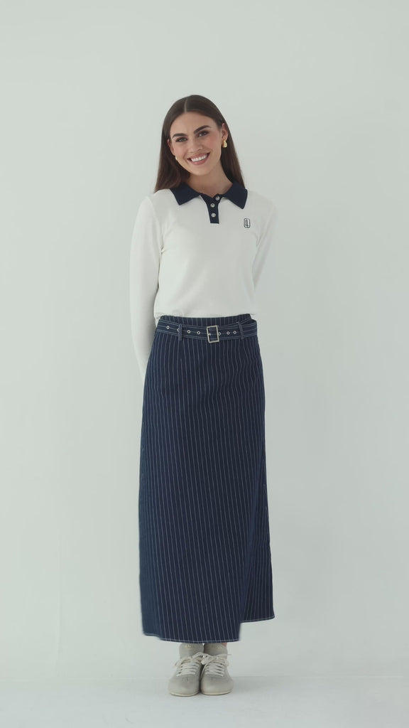 A timeless pinstripe A-line skirt designed to flatter with every step. Finished with the most adorable matching pinstripe belt, it cinches the waist beautifully while keeping the silhouette clean and feminine. Light, polished, and effortlessly chic, it elevates every summer outfit with that perfect tailored touch.
