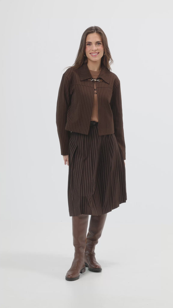 A brown pinstripe jacket featuring a horse bit buckle under the collar for a chic, adjustable closure. Pair it with our matching pinstripe pleated skirt for a sophisticated and trendy ensemble.