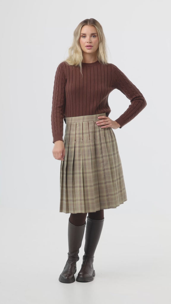 A classic tan plaid pleated skirt featuring sharp brows piping along the seam lines for a polished, tailored touch. Falling to the knee, it blends timeless charm with refined detailing for effortless everyday elegance.