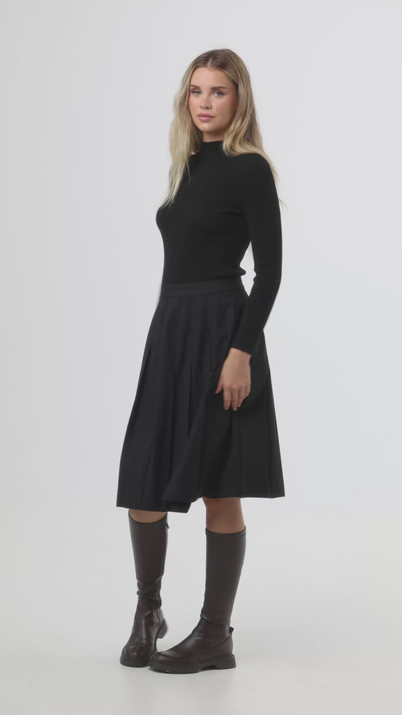 A knee-length black pleated skirt designed as the ultimate wear-with-anything wardrobe staple. Timeless and versatile, it can be dressed up or down, making it your go-to everyday best skirt.