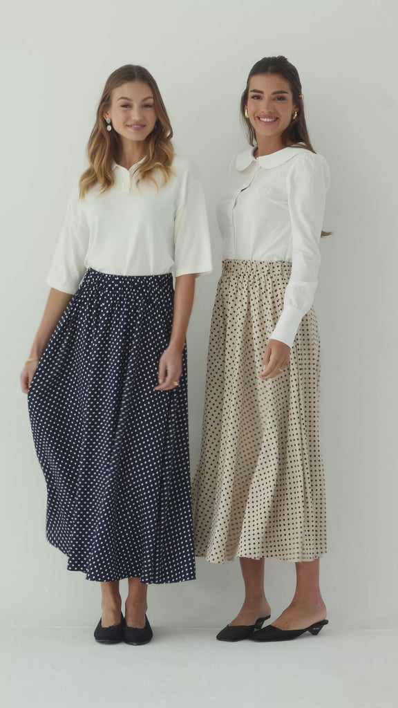 A timeless Navy and white polka dot skirt designed to feel as good as it looks. Featuring a comfortable elastic waistband for the perfect fit, it flows into a full, girly silhouette that moves beautifully with every step. Easy to dress up or down, it’s the kind of piece you’ll reach for again and again.