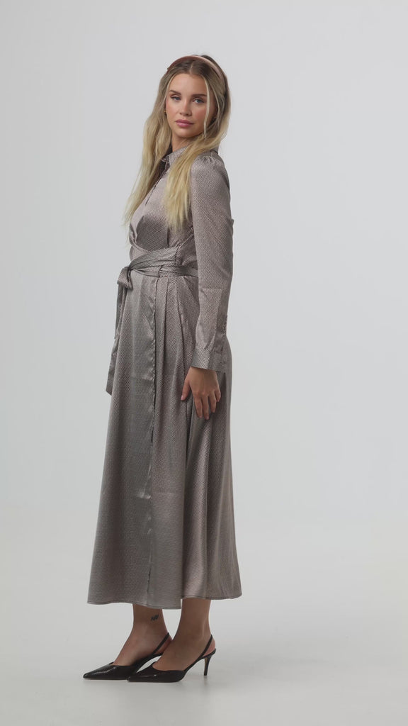 A brown dress with a subtle cream link print, featuring buttons down to the waistline and a flared skirt for a flattering silhouette. Waist ties create a wrap effect to cinch and define, making this easy, comfortable dress an elevated everyday basic.